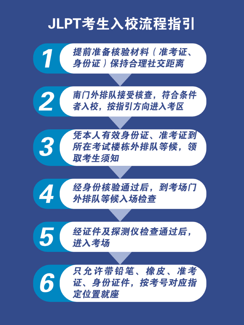 5. N1、N2级别8:55截止入场; N3、N4、N5级别14:40截止入场。考试过程中,禁止考生离考。